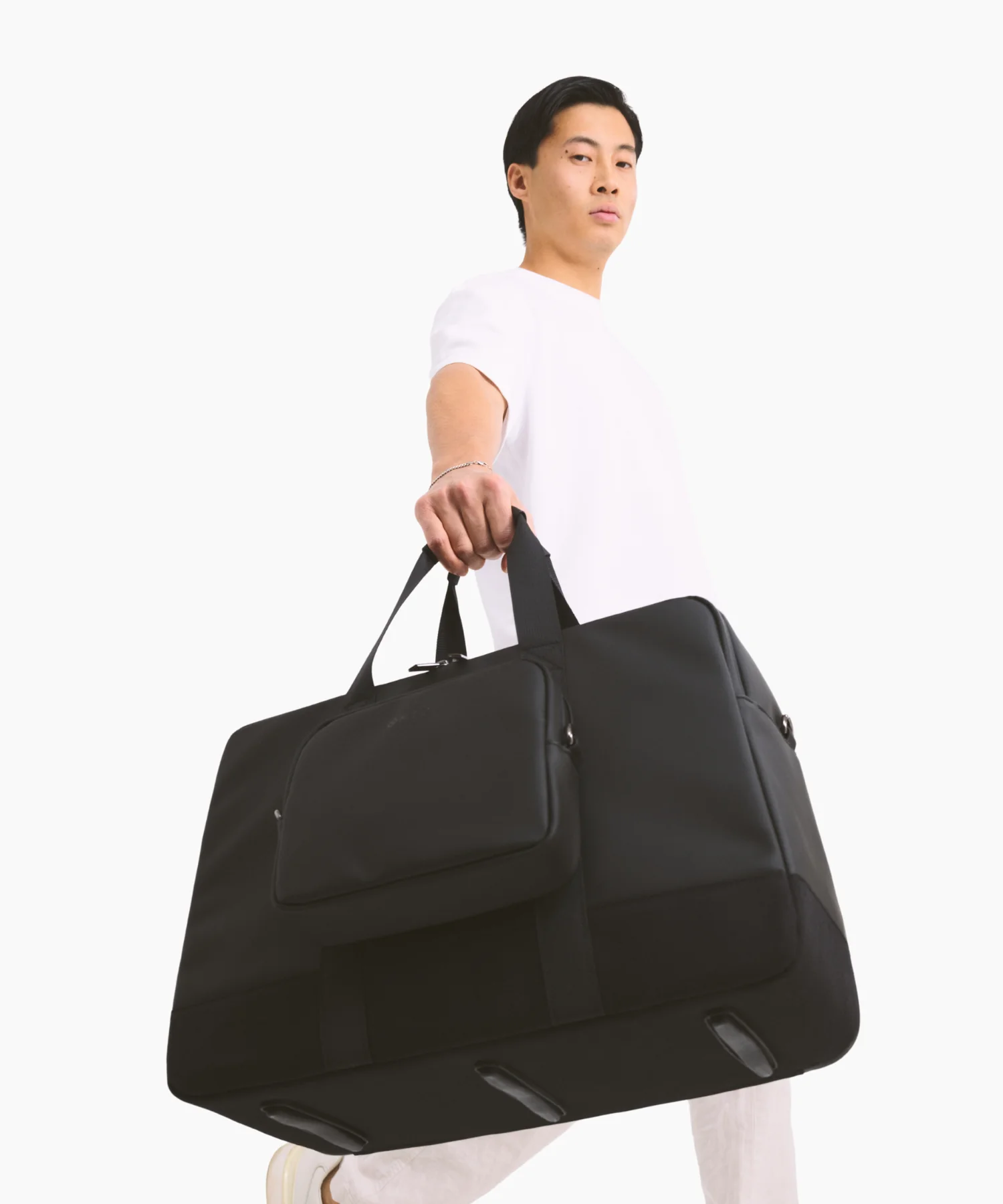 Gemaakt van gerecycled polyester met PU-vegan leer en afgewerkt met een waterafstotende, krasbestendige coating, kan deze duffel moeiteloos mee in je drukke routine én op elke trip.